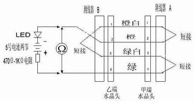 3.证实了甲端水晶头配接没有问题后,可将乙端的网线剪齐,再配上水晶头,然后将测线器B接上,再用万用表或发光二极管加5号电池测橙线和绿线通不通,若通,则说明乙端水晶头配接良好;若不通,则需重新配接乙端的水晶头。