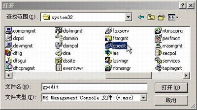 4.在控制台窗口中选择“控制台菜单”下的“C:\Winnt\System32\Gpedit”项(如果没有此项,则选“打开”项,然后依次打开“C:→Winnt→System32→gpedit.msc”,如图所示),即可进入组策略编辑器。