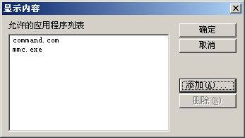 答:要组策略编辑器不会被禁止运行,请添加“mmc.exe”命令;要Ping等命令能正常使用,请添加“command.com”命令。添加了“mmc.exe”后即可直接运行“gpedit.msc”;添加了“command.com”后即可用它进入MS-DOS方式,便能运行Ping等所需的命令及其他在Windows下被禁用的程序了。