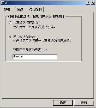 1.在桌面“网上邻居”处单击右键,然后依次选择“属性→访问控制→用户级访问控制”,并在“获取用户及组的列表”文本框中输入服务器的域的名字,以便从服务器中得到用户和组的列表。设置完成之后根据提示重新启动计算机。