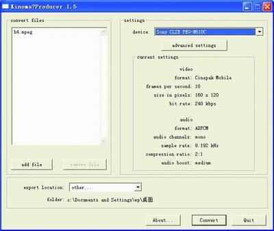 接下来在右边的Device列表中选择你的Palm的型号,然后在Export Location下拉菜单中选择影片保存的位置,包括Source Folder(源文件夹)、HotSync Folder(同步文件夹)、Memory Stick(记忆棒)、ReMovable Storage(移动储存器)、Other(其他文件夹)。建议大家选择Source Folder(源文件夹)和(其他文件夹),这样转换好的电影将会保存到硬盘上。选择好以后按下Convert按键就可以按照软件定义的推荐方式转换了。
