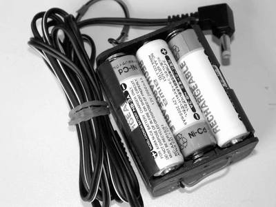 因为要外出拍片,所以拟定两种解决方案:一是做个充电器充电,二是做个外置电池盒,但买电子元件回来做充电器对我这非电子爱好者来说难度比较大,于是选择后者,尽量买现成的来个简单的DIY!仔细打量我的相机,电源适配器插口处标示为8.4V直流输入,插头中间为正极,原装锂电规格为7.4V,650mAh,看来镍镉或镍氢电池(1.2V)串联需要7节。考虑到充满电后实际电压会高出8.4V这个数值,所以买6节就可以。锂电芯由于涉及到保护电路问题,暂不考虑。(电池的电压、容量以及如何得到自己需要的电压等知识请大家参考以前的《电脑报》中有关电池的专题文章)