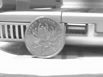 只要向前揭起电磁屏蔽和散热作用的薄金属片就可以看见这台电脑的主板了。大家可以看到,与5角钱的硬币相比,这台电脑内置的扬声器是很薄的。这也难怪系统音量一开大它就会出现声音沙哑的现象。因为音色的好坏与音波在扬声器内的行程长短有很大的关系。