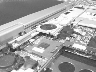 在拆除左上角的热管散热器后,就露出插在CPU插槽上的移动型赛扬1.13GHz处理器。