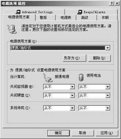 Windows中的节能设置:对于一般用户来说,在Windows系统中进行节能管理可能操作更明了简单一些。在“控制面板”中,选择“电源管理”选项,在 “电源管理属性”对话框中,应将“电源使用方案”设置为“便携/袖珍式”,并合理安排“使用电池”下方的“关闭监示器”、“关闭硬盘”和“系统待机”3个选项。