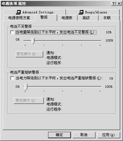 再选择“警报”一项,把“电池不足警报”及“电池严重短缺警报”两个选项前的“√”去掉,然后再关闭屏幕保护程序,之后用电池给笔记本电脑供电,当系统提示电池电量降为3%~5%时,把显示屏亮度调到最低(或者关闭显示屏),直至电量为0%,然后接上交流电源适配器给电池充电,一直充到100%。
