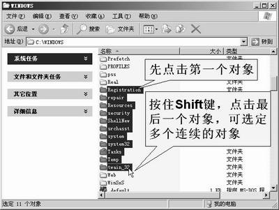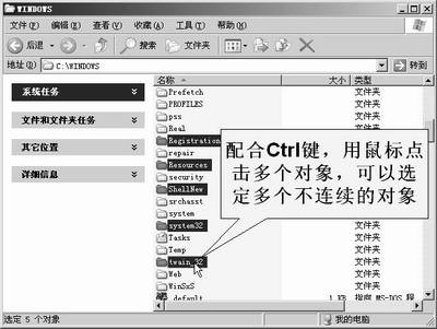 选择对象是从事其他操作(如删除、复制、移动等)的基础。选择单一的对象,我们用鼠标单击它就成,但选择多个对象时得用键盘配合着来操作。如你想选择图中几个不连续的文件夹,可按住Ctrl键,然后逐一选择你要的文件夹就可以将它们选定了。