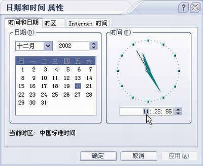 如果你的时间或日期不对,还可以调整。仍然把光标指向时间,双击,打开“日期和时间 属性”对话框,我们看到了“日期”和“时间”。先来看怎么改时间,在表的下面有时、分、秒三个数字,用光标把 “11” 时选中,从键盘上敲入正确的小时数,然后按键盘上的Tab键,把光标移到“25”分上,输入正确的分数,最后再次按Tab键,把光标移到“55”秒上,修改秒数。