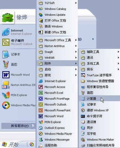 电脑上还有计算器,准确的说,是Windows操作系统带的一个好工具。那么它在哪儿呢?单击“开始”按钮,打开“开始”菜单,指向“所有程序”,在打开的子菜单中指向“附件”,又打开一个子菜单,看到“计算器”了吧。