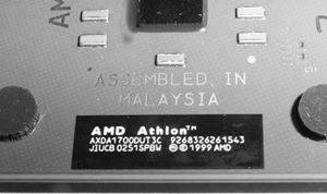 0.13微米,Thoroughbred B版核心速龙XP1700+处理器,在编号上可以看到DUT3C字样,这就表示它为1.60V工作电压,实际检测就是B版。 这颗CPU生产日期特别新,为51周。B版XP1700+超频性能极佳,使用166MHz外频可轻松超到了2000MHz,实际就是2400+的频率,CPU的零售价格为450元,大家快去抢购吧。