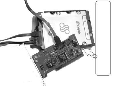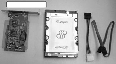 希捷酷鱼串行硬盘的配件(从左到右):PCI接口的串行ATA适配卡、串行接口硬盘、电源线、数据线。