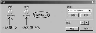 “微调”,范围为“-50%~50%”。也就是说如果升半个调都还是感觉高了,而原调又低了,我们可在“微调”中设定。例如,只升半半个调,设定“间隔”为0,“微调”为“50”。