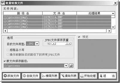 5.使用MiYa的“批量转换”功能,将i:\process\bmp目录下所有BMP文件转换为JPEG文件,转换时,将JPEG文件的保存质量选择为95或90,并选择转换后的文件保存在路径i:\process中,以覆盖初始的照片,如图2所示。