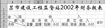 启动Excel XP(如果你用的是Excel 2000,也可照葫芦画瓢),同时选中A1至Y1单元格(具体单元格数目,根据你的报表实际列数确定),按“格式”工具栏上的“合并及居中”按钮,将它们合并成一个单元格,并输入公式:="某市建设工程监督站"&YEAR(TODAY())-1&"年财务报表",作为标题。其中函数式“YEAR(TODAY())”用于提取当前日期的“年份(2003)”,“-1”表示上一年(2002年)的报表。