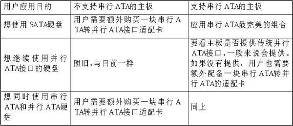 那么,当前用户如何正常用上串行ATA硬盘呢?笔者对用户的应用目的、条件及解决办法大体上进行了一个统计(见附表)。