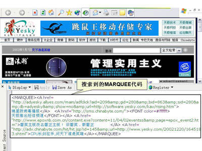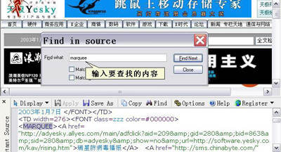 如果想查找某个网页的活动字幕源代码时,只要将“Display”的状态设置为“Entire page”,然后选择“Find”菜单,在弹出的对话框中输入“marquee”(图2),很快网页的活动字幕的源代码就显示出来(图3)。我们可以将它复制到我们的网页代码窗口中,根据自己的需要进行修改,为自己的网页添加特殊效果。