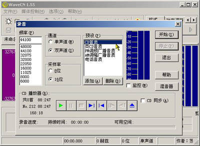 先在播放器(可以是Realplayer或Windows Media Player等)中打开在线播放的电影,等放映到歌曲开头处时单击播放器的“暂停”按钮,然后运行WaveCN 1.5软件,单击工具栏上的“录音”按钮(红色实心圆点),当出现“录音”界面后(如图),先不要急着按“开始”按钮,而转到播放器的界面中单击“播放”按钮,然后迅速回到WaveCN的界面,单击刚才已打开的“录音”界面上的“开始”按钮即可。