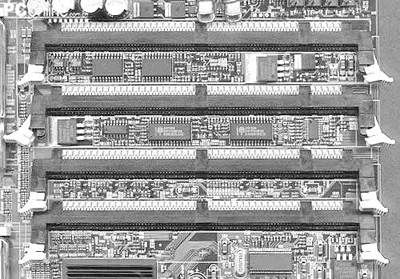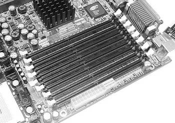 从服务器的用途来看,我们可以看到服务器对内存的需求是很大的。如E7500 Master-LS主板上有6根DIMM插槽,最大可支持12GB PC2100 DDR SDRAM(仅支持Registered ECC内存)。有的服务器主板甚至有8根内存插槽,最高可支持16GB的内存(图1),这种内存扩充能力是普通台式电脑无法比拟的。同时为了节省主板的空间,在DIMM插槽设计上,一些服务器主板采用斜向成25度角设计(图2),与PC主板上DIMM插槽不同。