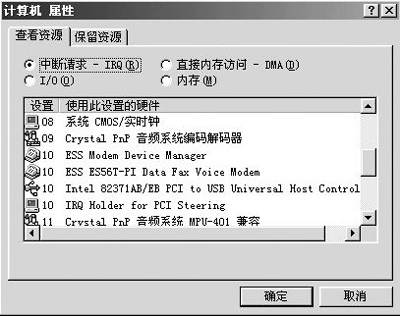 这时笔者猛然想到,会不会问题就出在这个内置Modem上呢?于是笔者在系统属性中仔细检查了这块ESS内置Modem的资源设置,也没有发现有黄色的惊叹号,不过当笔者选择“按连接查看设备”,然后再点击“计算机”显示所有的IRQ中断时却发现,原来这块ESS内置Modem和USB设备都使用的是中断10(如图),这下子终于发现了问题之所在,果然是和Modem有冲突(另一台电脑使用的外置Modem占用中断3,所以没有冲突),这么明显的冲突,可是Win98居然“视而不见”。