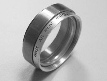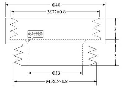 笔者爱机是金拍得丽DC3460,非标准口径,所以首先要确定转接环的外口径:DC3460的口径是35.5mm,所以我选择了滤镜品种齐全、价格较低的37mm口径(便携摄像机的常用口径),这样一来不会因为小于原口径而遮住一部分画面,二来不会太影响美观。其次要确定材料:最好的材料应是铝合金,轻巧美观,但笔者一直没找到合适的铝材,而且发现加工也不便,最后确定使用黄铜,虽然与爱机银色的机身不那么相配,但材料好找,加工方便。下一步就是画图,请见图1。要注意的是:1.螺纹应使用标准细牙螺纹,每厘米8个牙;2.便于加工,两端可留长一点,车好后再一点点地磨短。磨时将砂纸平铺在桌上,加点水,用手按住环来回磨,用力一定要均匀,磨几下看一看,以防磨歪。磨到最后越短越好,两端各留2~3个牙即可;3.图1中标明倒角的位置最好要倒角,以免遮挡镜头;4.试装在相机上之前要用细砂纸将各处打磨一遍,以防留有毛刺刮伤相机。完成后外形如图2(银色的是UV镜),图3是装在爱机上的效果。