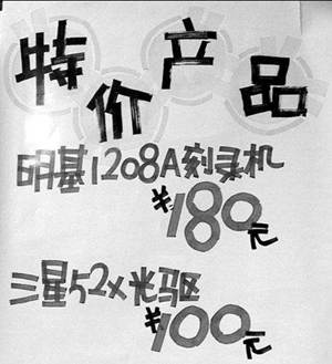 被180元“贱卖”的CD-RW是老款的Acer(宏碁)1208A,12速刻录,8速覆写,32速读,而100元的CD-ROM是三星的52×读盘将军。据该商家老板介绍,这些光驱都是积压产品,为了资金的回笼,才进行超低价销售的。呵呵,相信这些产品很快就会被抢购一空的。