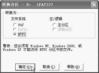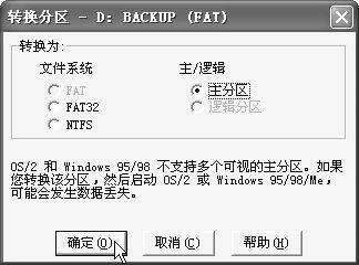 如果要转换的分区上面有文件正被系统使用,那么在转换时,转换程序将会询问是否卸下要转换的卷(即分区),这时最好选择“否”,最后它就会询问是否在下一次计算机启动时转换分区,选择“是”并重新启动机器即可完成转换。