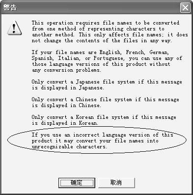 2.此时会弹出一个警告窗口(图2),提示我们如果使用了不正确的语言版本有可能将文件名转换为不可识别的字符。当仔细核实无误后,点击“确定”按钮。
