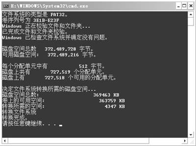 4.在文件系统转换过程中,会弹出我们在Windows 2000/XP系统下面常见的“cmd.exe”命令窗口(图4),在其中可以清晰地看到转换的详细情况。转换完成后,按下任意键,则会返回“所有操作已完成”提示信息对话框,最后点击“确定”按钮即可大功告成!