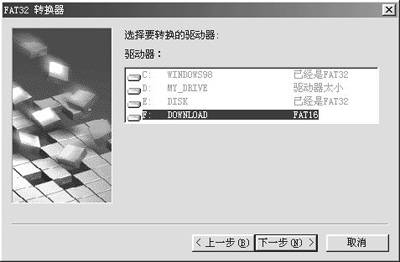 1.在Windows 98中,欲将FAT转换为FAT32文件系统,你只要用鼠标点选“开始→程序→附件→系统工具→驱动器转换器(FAT32)”命令,在“FAT32转换器”向导窗口中,点击“下一步”按钮,在“选择要转换的驱动器”画面中,选择列表中欲转换的驱动器(例如“F:DOWNLOAD”)(图6),点击“下一步”按钮,按照向导的提示,即可完成文件系统格式的转换。