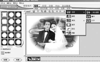 6.点“编辑→装饰→边框→二维/遮罩”,在装饰里面我们看到除了丰富的边框和画框外,还有道具签名等一些设置,这对图形处理提供了丰富的素材。这里我们需要给照片加上一个漂亮的边框,在“边框→二维/遮罩”里面有几十种边框供你选择,选择一种边框后,点应用就可以了,结果参照图6。