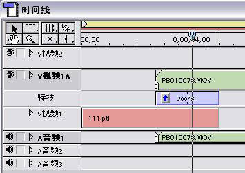 4.关掉Title编辑器,在素材文件夹中可以看到添加了一个Title图标,使用鼠标拖曳它到时间轴线的“视频1B”轴上,再拖曳“视频文件1”到时间线的“视频1A”轴上,并且放置在稍微靠后的位置。在工作区域右侧的“特效”面板上选择Door特效,使用鼠标将它拖曳到时间线的“特效”轴上,放置的位置如图所示(图4)。