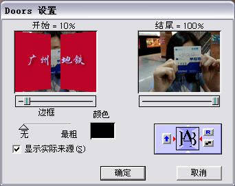 5.双击“特效”轴上的Door特效将弹出特效设置对话框,将“显示实际来源”前的选择框勾选,就可以在通过拖动“开始”或者“结尾”处的滚动条来预览效果(如图3)。设置好后,点击确定就完成了特效的设置。