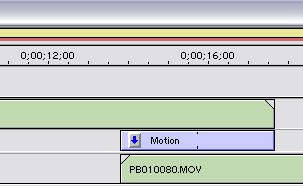 6.从素材文件夹中拖曳“视频文件2“到时间线的“视频1B”上,注意放置的位置与“视频1A”上的“视频文件1”有部分重合,从“特效”面板中选择“Motion”特效,将它拖曳到“特效”轴上如图位置(图4)。
