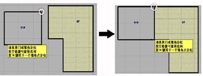 结合建筑图纸,下一步我们按照客厅的设置方法分别设计好其他的房间。在这里需要注意的是,在第二个房间设置好后,将它在工作区放置时按照提示,按下键盘上N键,来切换定位点,如图3:将红色的定位点切换到客人房的右上角,然后移动鼠标将客人房移动,当和客厅的红色圈的墙角点接近到一定程度,软件的磁吸功能会自动把两个墙角点重合,在这个状态下,单击鼠标左键完成两个房间的结合。
