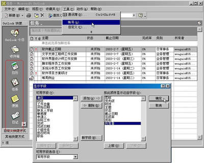 当然,当你第一次打开Outlook 2000时不会是图1所示的界面。在正式下达任务之前,必须做好以下设置:首先,需要在“工具”菜单的“账号”选项中设置你的默认邮件地址,并设置好POP3/SMTP服务器地址;然后在软件空白处单击右键,选择“显示字段”。并在弹出窗口中添加“类别”和“所有者”的字段名;最后将任务视图调整为“详细列表”就可以了。一切设置好后,就可以正式开始我们的任务之旅了。