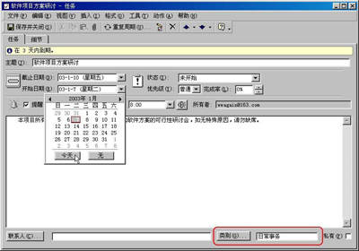 单击Outlook 2000工具栏上的“新建”按钮,在如图2所示的窗口中,填上主题:“软件项目方案研讨”。在这里,会议时间定为星期五上午的9:00举行,因此在“截止日期”的下拉窗口中我们点选“1月10”日字样(本文仅举例说明,具体时间大家视自己的情况设定),而在“开始日期”中选择“今天”就行了。如果你担心那天会有人睡过了头,还可以在“提醒”功能中设置在“星期五”上午“8:00”用铃声提醒!当然,还有一项请不要忘记,那就是在每条任务下方的“类别”栏中填上相应的类别名称。如果你细心的话,也一定会发现,在“所有者”一栏中,所有者正是我们填写的默认邮件地址所有人。在这里,显示的是wwagain@163.com(见图2)。