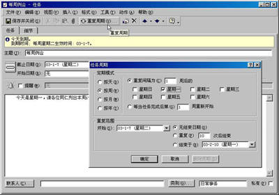 前几个步骤大致相同,单击“新建”按钮,在“主题”、“开始/截止日期”、“内容”等栏中分门别类地填入相应信息。但之后可别忘了,一定要按下“重复周期”按钮。在如图3所示弹出的窗口中,将“定期模式”设置为“每周”,而“重复间隔时间”为一周后的“星期一”。最后,在“重复范围”区域中选择“开始”于“今天”且“无结束日期”。这样,从今天以后的每个星期一,小张部门下的每位员工都会收到一份内容为“今天是星期一,请各位同仁列出本周计划及上周工作总结,并传至项目负责人手中,谢谢合作,祝你本周工作顺利!”的任务条了。呵呵,是不是事半功倍!