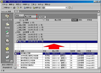 这是管理任务的第一步。最初不是在每条新建任务的“类别”栏中都填写了相应的“类别名称”吗?现在就是它们的用武之时了。只要将各条任务分门别类地分组排列,这样小张的工作就会轻松得多。