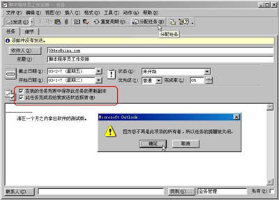 在任务列表中双击需要分配的任务条目,在这里我们选择“脚本程序员工作安排”任务。在“收件人”输入框中填入收件人邮件地址,如填入594wo@sina.com(注意:不能向自己发送),并请一定选中“在我的任务列表中保存此任务的更新副本”和“此任务完成后给我发送状态报告”两大选项(如图6框线所示)。单击“分配任务”按钮,此时Outlook2000会弹出一个“因为你不再是此项目的所有者,所以任务的提醒被关闭”字样的窗口,表示当任务发送出去之后,该任务的所有者就变成了“收件人”,而不再是小张了。