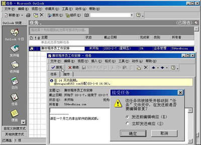 现在来看看594wo@sina.com的Outlook,我们会发现,在收件箱已经收到了由小张(wwagain@16 3.com)发出的“工作安排”了。与普通伊妹儿不同的是,双击该邮件,在打开窗口的工具栏中竟然多出了两个按钮“接受”和“谢绝”。显而易见,如果不想被炒鱿鱼的话,还是点击“接受”吧。此时Outlook会立马弹出一个名为“接受任务”的对话框(图7)。在选择了“发送前编辑响应”之后,那么这封邮件就自动转移到接收者的任务列表中了。