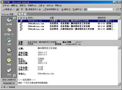 如果再回到小张的Outlook中,你会发现一封名为“已接受的任务:脚本程序员工作安排”的邮件已经躺在小张的“收件箱”中了。是不是有网络办公自动化的感觉?事实上,更“神奇”的还在后头呢!
