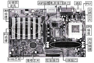 主板上布满了各种电子元件、插槽、接口等。它为CPU、内存和各种功能(声、图、通信、网络、TV、SCSI等)卡提供安装插座(槽);为各种磁、光存储设备、打印机和扫描仪等设备以及数码相机、摄像头、“猫”(Modem)等多媒体和通讯设备提供接口。