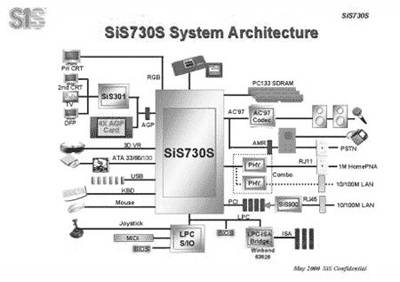采用单芯片技术的主板芯片组由于只使用一个芯片,这种设计有明显的成本优势,与分布式的两个芯片相比,单一芯片提供了高整合性与低成本。更重要的是,采用单芯片技术能够简化主板的设计,减少信号线的连接,从而也减少了电磁干扰,在一定程度上提高了系统稳定性。SiS630是一款支持Intel PⅢ系列的产品,不仅在低价台式机中有广泛应用,目前在使用PⅢ-M的超轻薄笔记本电脑中也得到了广泛应用。在SiS630取得成功后,SiS推出了同样采用单芯片构架,支持AMD SocketA处理器的SiS730芯片组。
