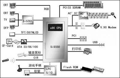 SiS550系列芯片所整合的处理器支持x86指令集,内置3个整数单元和3路超标量架构以及1条管线浮点单元。在显示方面,SiS 550系列芯片整合了Ultra-AGP技术,并具备高性能GUI内存共享带宽(最大支持128MB的显存),以及DVD解码功能,因此在视频方面的效能也很强劲。SiS 550芯片提供了标准的CRT显示器接口,并支持DVI扩展输出。SiS550系列芯片还将传统南桥的功能也包容其中,提供了大量的外部设备连接以及控制接口,支持AC'97接口,支持硬件DirectSound加速和内部采样率转换、专业波表和独立的调制解调器DMA控制器。SiS 550芯片支持LPC接口,3个USB接口和CIR控制器,可以提供全面的有线、无线通讯扩展(图2)。