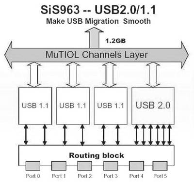 而伴随着SiS963南桥的大量应用,MuTIOL技术得到了再一次提升,带宽扩大了整整1倍,从而能够满足不断提升的外设传输频率(图4)。