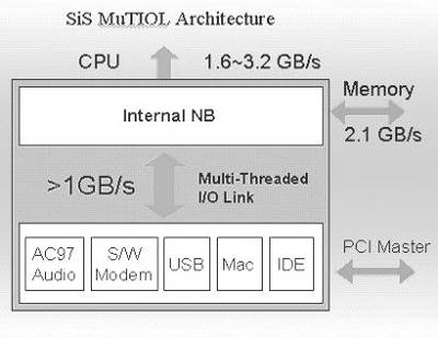 SiS的MuTIOL技术全称是Multi-Threaded I/O Link,意为“多通道I/O链路”,其中文名字相当形象:“妙渠”。这一主板架构形式首次出现在SiS635芯片组中,SiS635作为一款单芯片产品,本身内部已经集成了南桥功能,所以MuTIOL技术最初是负责单芯片中南北功能模块数据传输的通道。根据矽统公司的介绍,从技术角度来看Multi-Threaded I/O Link主板芯片总线技术负责了8个设备的数据传输,它们是:PCI总线(其上的所有设备对Multi-Threaded I/O Link来说就是一个设备)、第一IDE通道、第二IDE通道、第一USB通道、第二USB通道、AC'97音频、V.90软Modem、媒介访问控制器(MAC,Media Access Controller,主要为以太网数据传输服务)。在具体设计上,Multi-Threaded I/O Link其实就是8条独立的数据管道,每条管道的工作频率是33.3MHz,传输数据位宽为32bit,这样一条管道就相当于一条32位PCI总线的带宽133MB/s,8条的总和就达到了惊人的1.2GB/s。