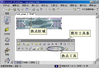 当浏览者在网页图片上的不同位置按下鼠标左键,就可链接至不同的网页,你是不是也想制作这样的效果呢?FrontPage 2002提供了在一张图片上非常简便地制作多个超链接的制作工具。利用鼠标在图片上拖曳,我们就可以直接将图片划分出许多不同的区域并制作出多个超链接了。