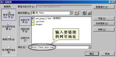 6.在紧接着弹出的“建立超链接”对话框中,直接选择或输入要进行超链接的网页地址,然后按下“确定”按钮关闭“建立超链接”对话窗口(图2)。