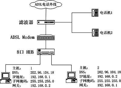 网络连接如图1。滤波器(话音分离器)与ADSL Modem由供应商提供,它们之间都有专线连接。ADSL Modem的RJ-45口,通过双绞线与8口HUB的UpLink口相连(当双绞线用交叉接法时,与第8口相连);各台计算机网卡上的RJ45口,通过双绞线连到HUB的第1~第7的任一口上(不能是第8口)。