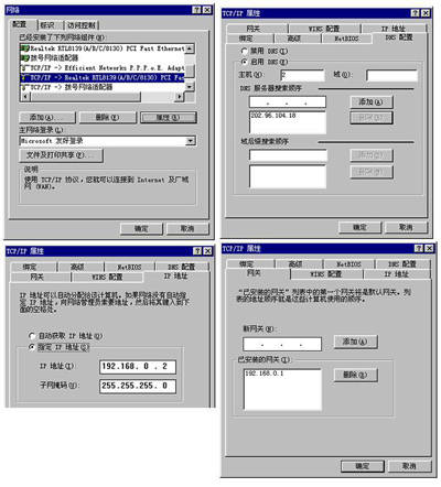首先在“控制面板”,双击“网络”图标,打开“网络”对话框,在“配置”选项中,对网络的“TCP/IP属性”作如图2的设置。